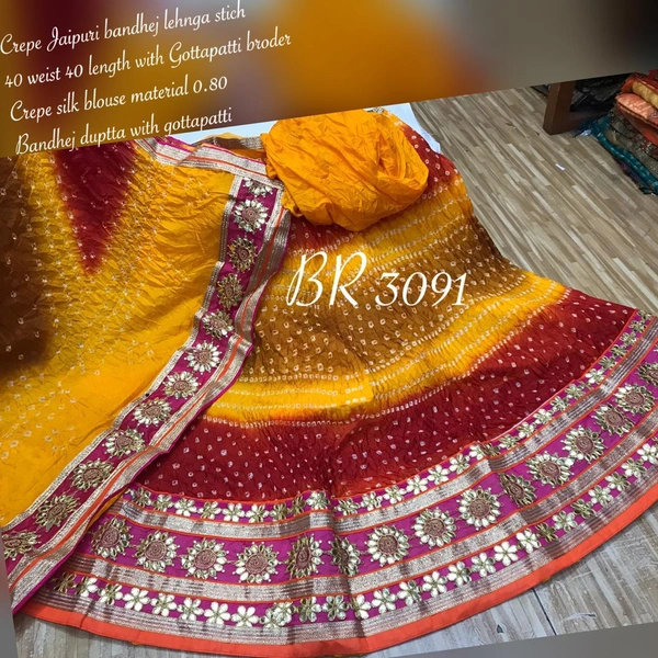 Care Instructions: Dry Clean Only Material: Silk Size: Free Size Lehenga type: stitched. Lehenga size: Waist upto 40, Length 40. Blouse: Dupin Blouse. Dupatta: Bandhej Dupatta gota patti border.